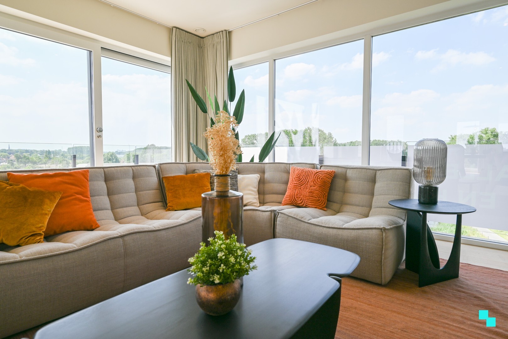- Maatmeubilair, zonverduistering, verlichtingsarmaturen, gordijnen en schilderwerk inbegrepen