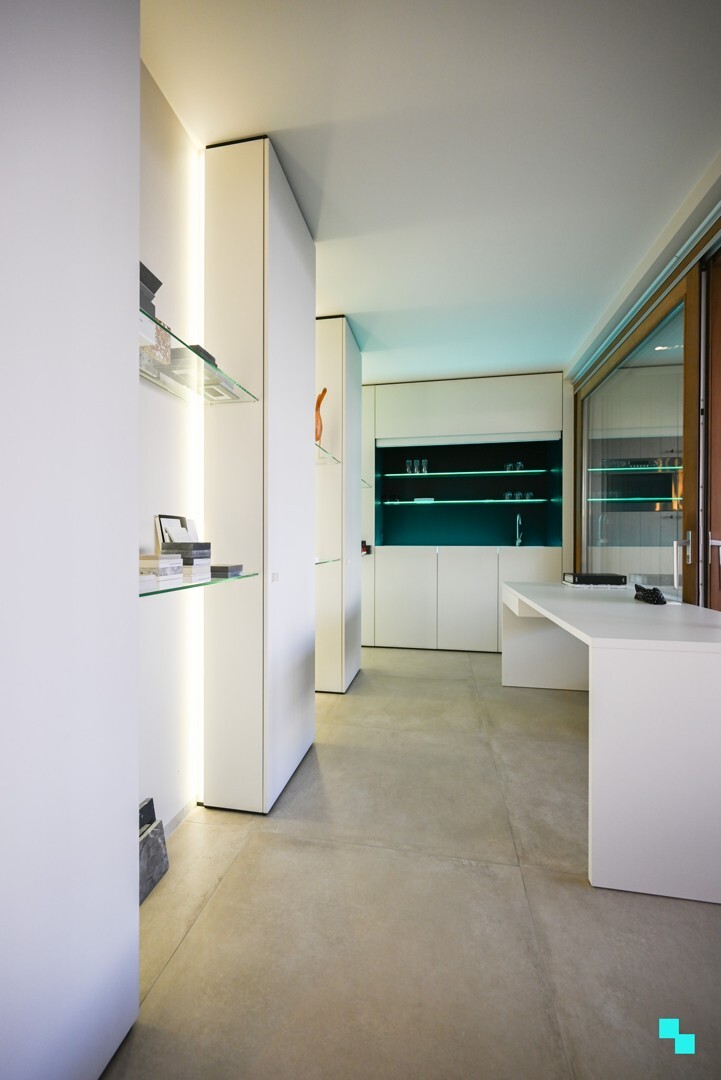 Centrale inkomhal, apart toilet voor de handelsruimte, technische ruimte en toegang naar het appartement en de handelsruimte die beiden kunnen afgesloten worden. De handelsruimte werd ingericht als showroom en beschikt daardoor over o.a. een gashaard, houthaard, een hyper uitgeruste keuken en een kleinere keuken. Het venster die opgedeeld is in diverse glaspartijen kan volledig opengeschoven worden waardoor de keuken met houthaard deel kan uitmaken van het buitenterras op warme zomeravonden. Het appartement heeft op de gelijkvloerse verdieping de inkomhal met wasplaats.Eerste verdieping