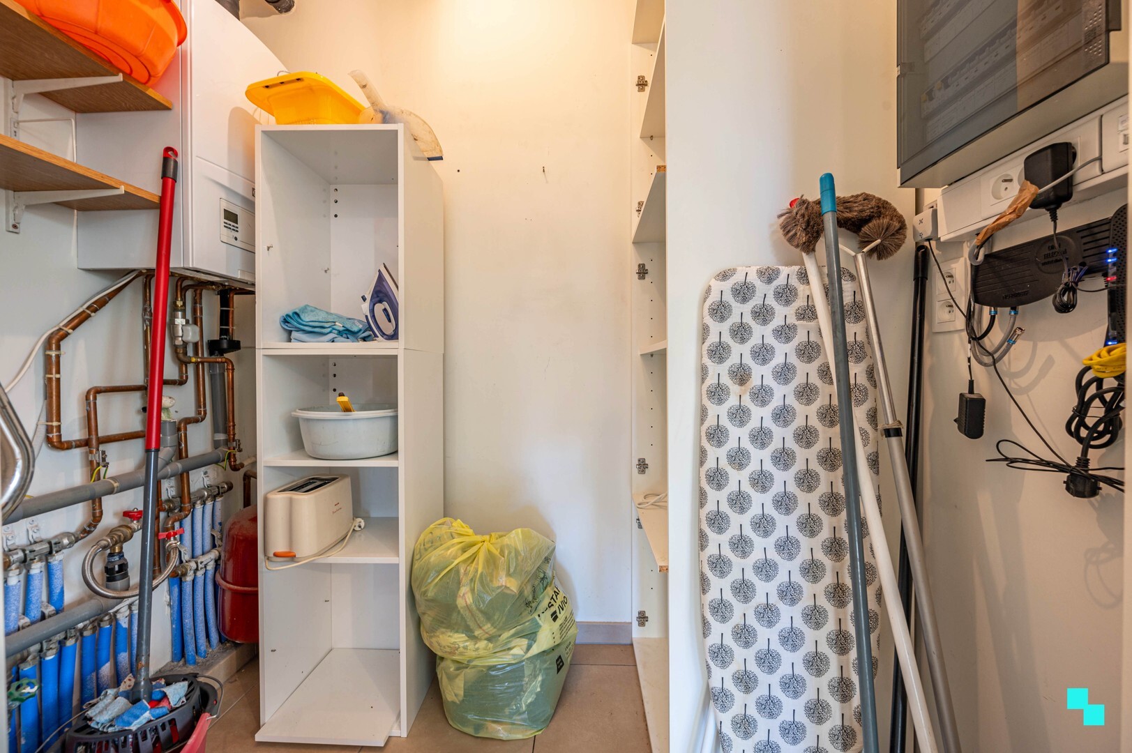 inkomhal met gastentoilet, aangename woonkamer met zicht op de open geïnstalleerde keuken (volledig uitgerust met alle nodige apparatuur) met annex de aparte berging/wasplaats. In de nachthal bevinden zich twee slaapkamers en een ingerichte badkamer (inloopdouche, enkele wastafel en toilet). Het appartement beschikt over twee terrassen, die samen een schitterend panoramisch zicht bieden over de achtergelegen Mandelvallei. Hier kunt u genieten van de rustige en groene omgeving, perfect voor een ontspannen ochtendkoffie of een gezellige avond met vrienden en familie.Kelderberging