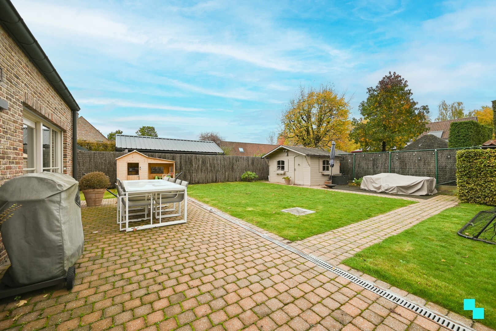 Oprit voor meerdere wagens, tuin (N), terras en tuinberging.Technisch
