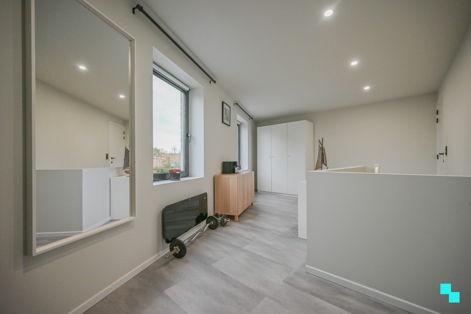 In de inkomhal bevindt zich een trap naar de eerste verdieping waar zich drie slaapkamers bevinden. Er is ook een trap in de multifunctionele ruimte. Daar bevinden zich op het verdiep zowel de badkamer, een zeer ruime hal die ook multifunctioneel kan benut worden en de 4de slaapkamer.Exterieur