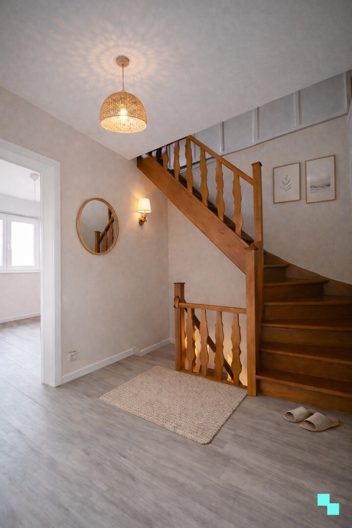 Inkomhal met gastentoilet en toegang tot de kelderruimte. Verder beschikt de woning over een woon- en eetkamer, een kleine geïnstalleerde keuken met deur naar de tuin en een rechtstreekse doorgang vanuit de inkomhal naar de tuin via een gangetje.Eerste verdieping