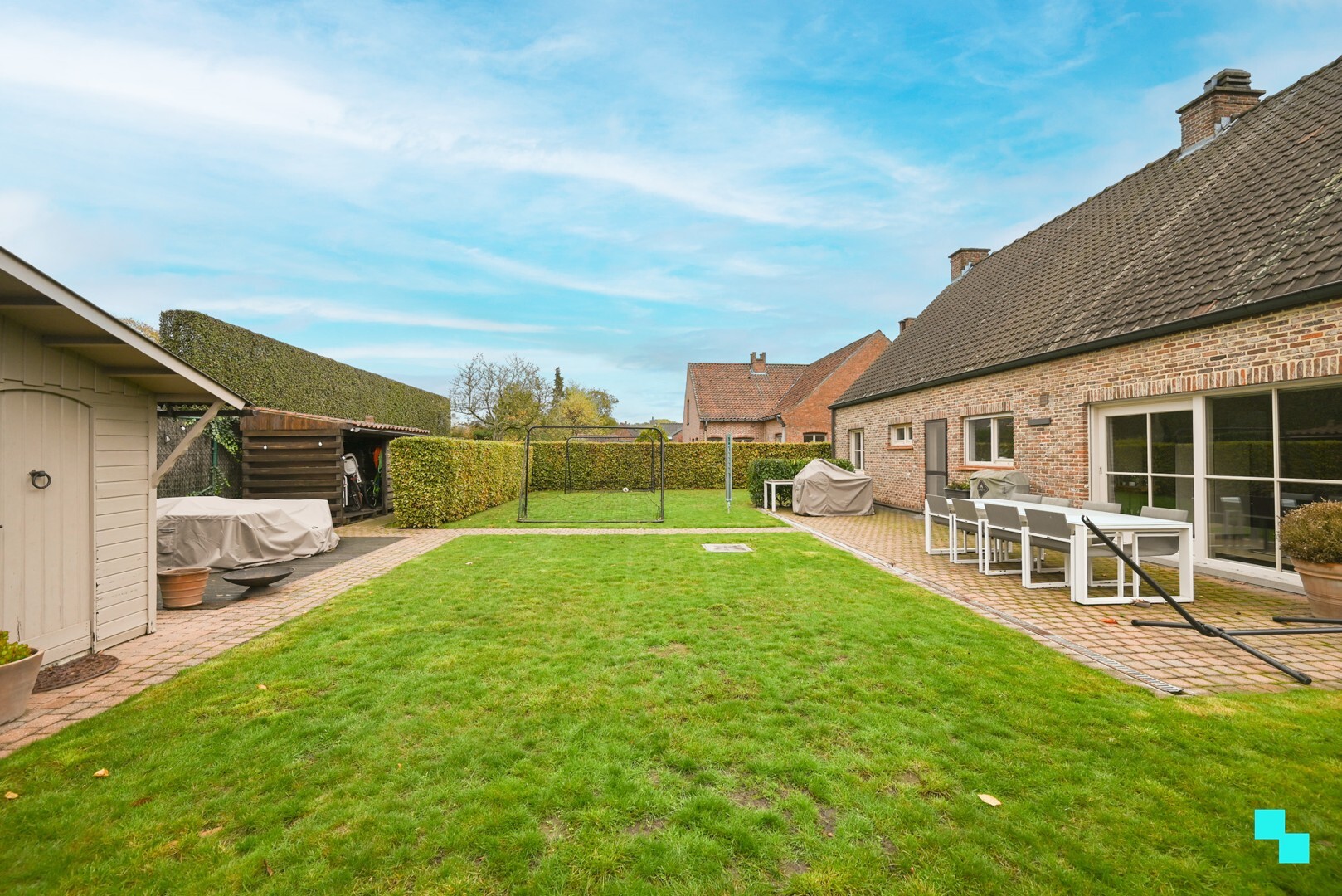 Oprit voor meerdere wagens, tuin (N), terras en tuinberging.Technisch