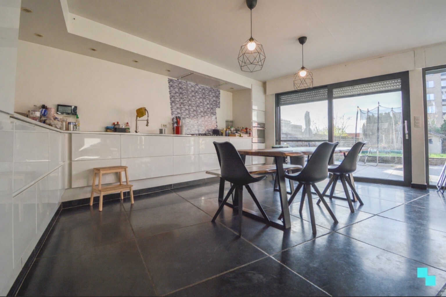 U wordt verwelkomd in de inkomhal met apart gastentoilet. De woning beschikt over een uitzonderlijk ruime en lichtrijke leefruimte, geïnstalleerde open keuken met zicht naar de tuin, inpandige dubbele garage met geautomatiseerde sectionaalpoort, praktische wasruimte en rechtstreekse toegang naar de tuin.Eerste verdieping
