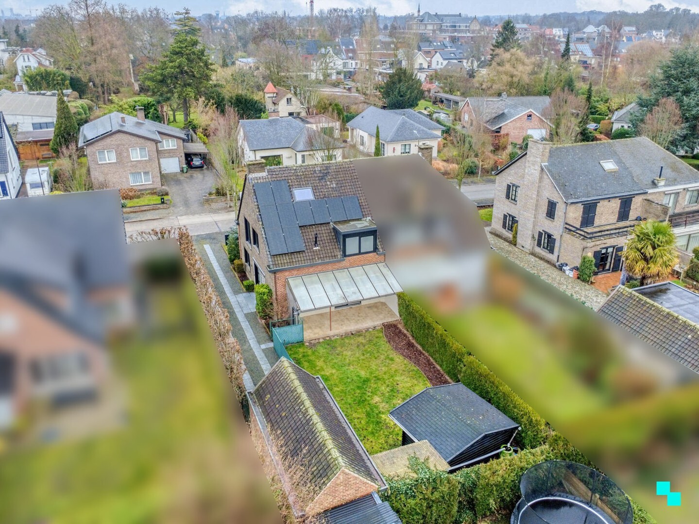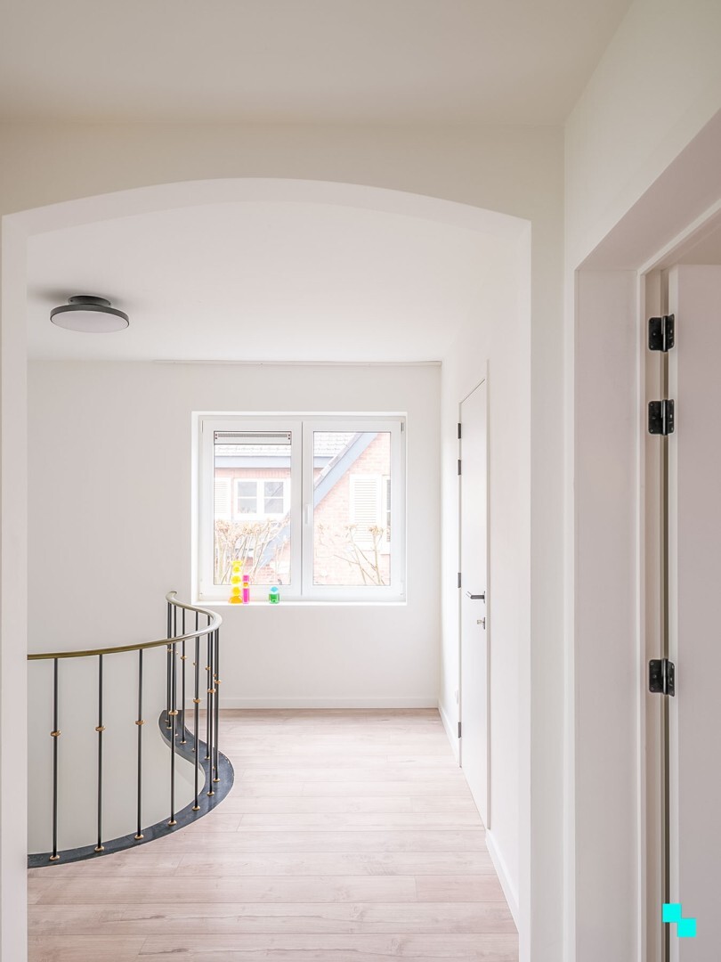 Statige inkomhal met gastentoilet die meteen het royale gevoel van de woning benadrukt. De lichtrijke leefruimte sluit naadloos aan op de grote keuken met aanpalende bijkeuken/wasplaats. Grote raampartijen zorgen hier voor een sterke connectie met het overdekte terras en de tuin.