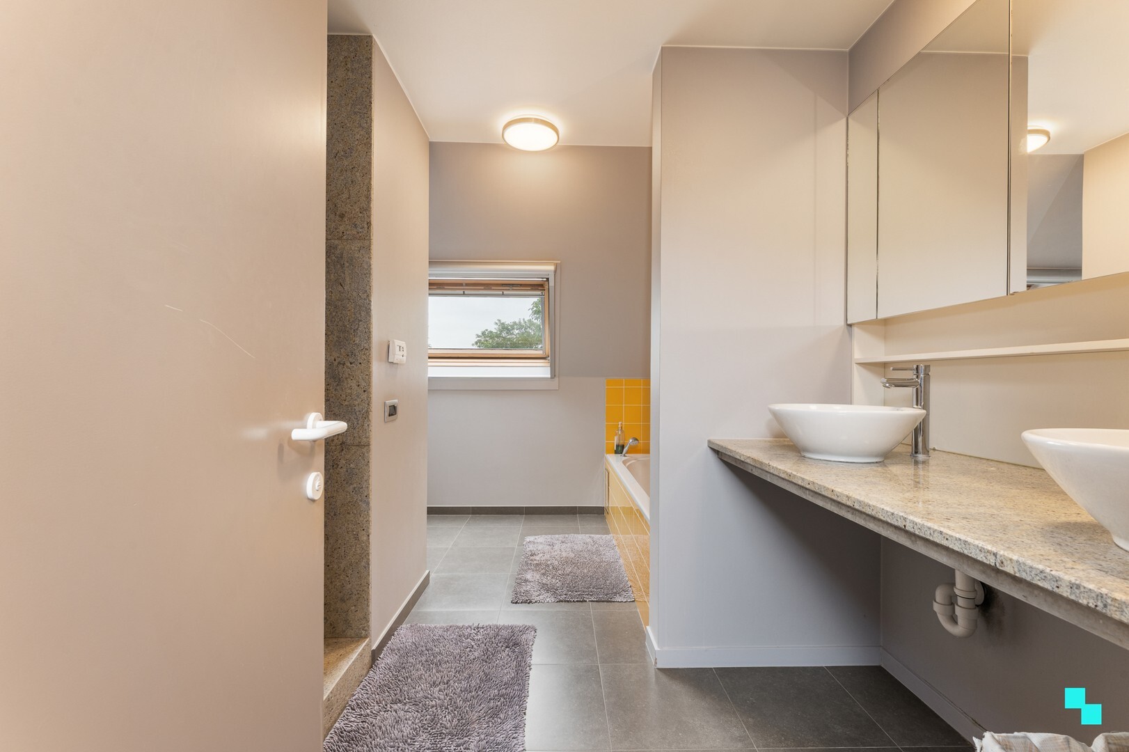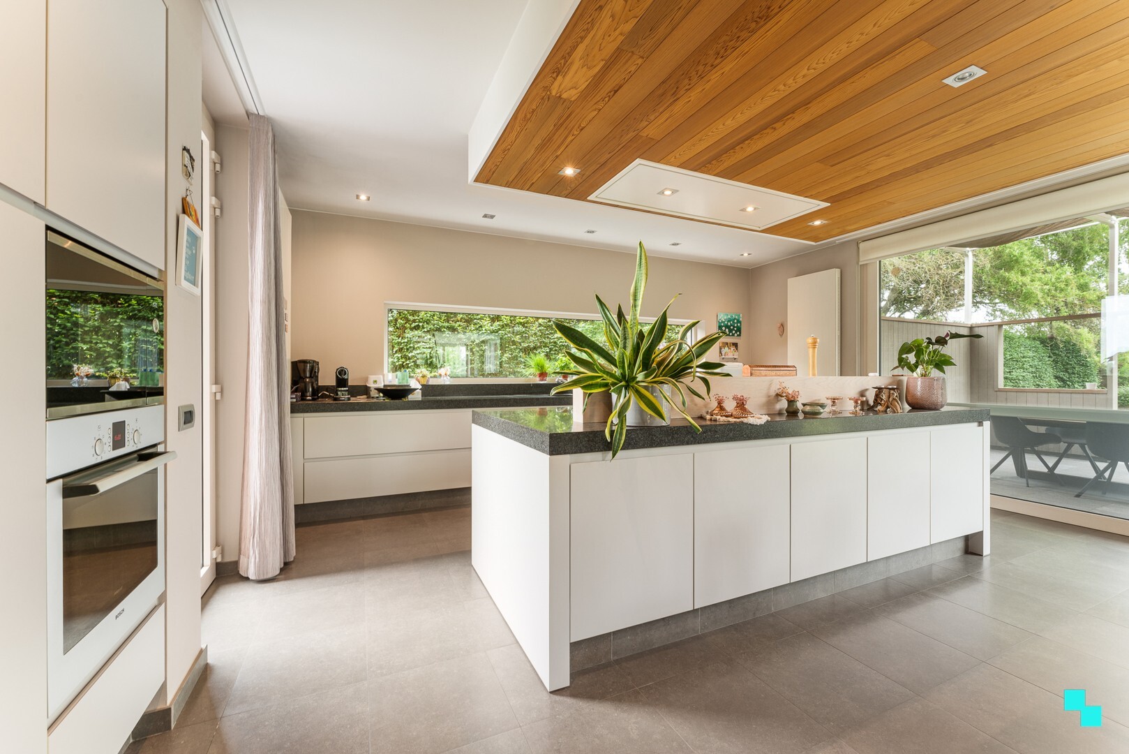 Inkomhal met vestiaire en gastentoilet, iets dieper gelegen woonkamer met fantastisch zicht op de tuin, hyper geïnstalleerde keuken met aansluitend (overdekt) terras en annex berging/wasplaats.Eerste verdieping