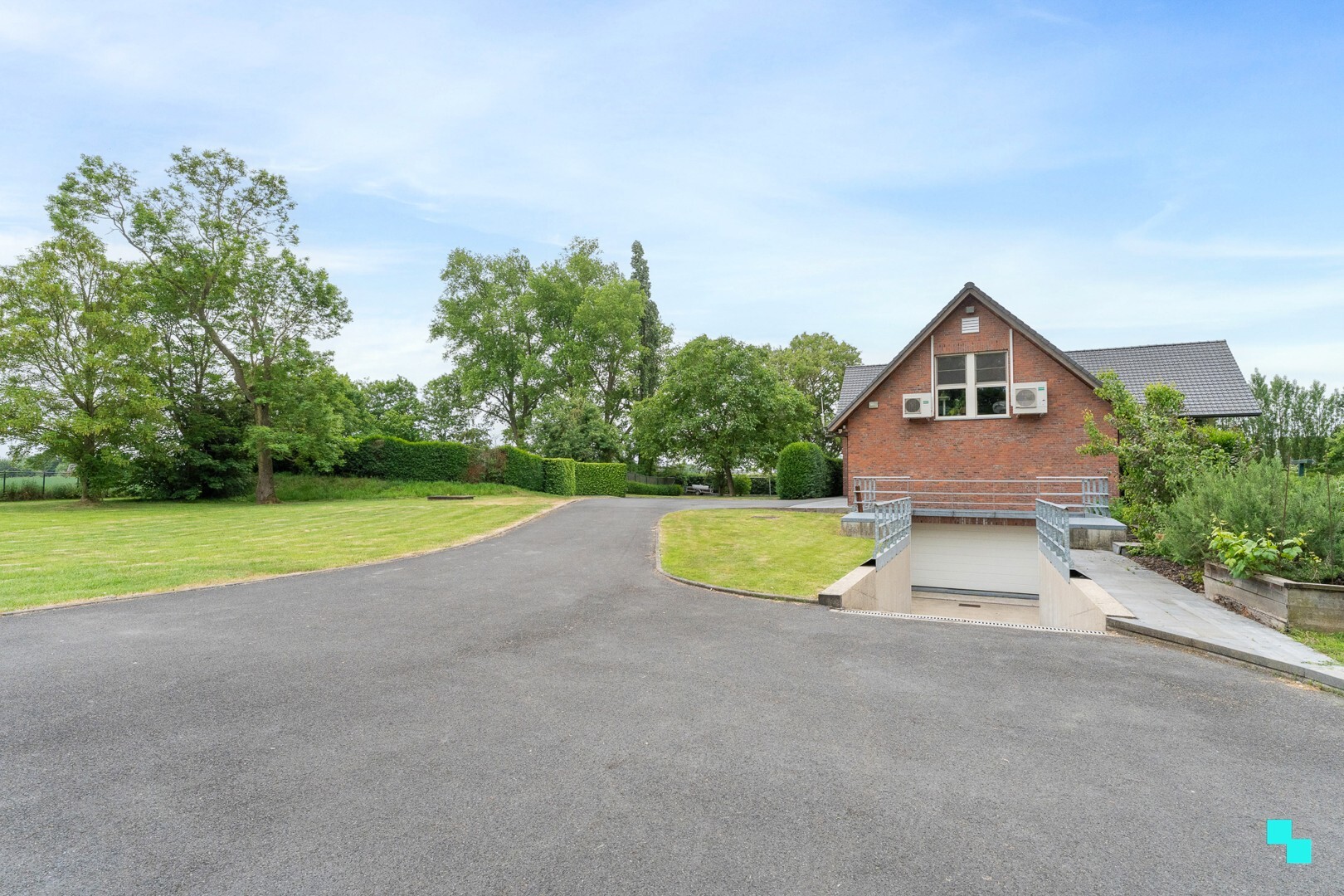 Volledig omheinde tuin, riante oprit met geautomatiseerde poort, inrijhelling voor garages in kelder, aparte garagebox, opbouwzwembad met sturing en de gezellige chalet.Chalet