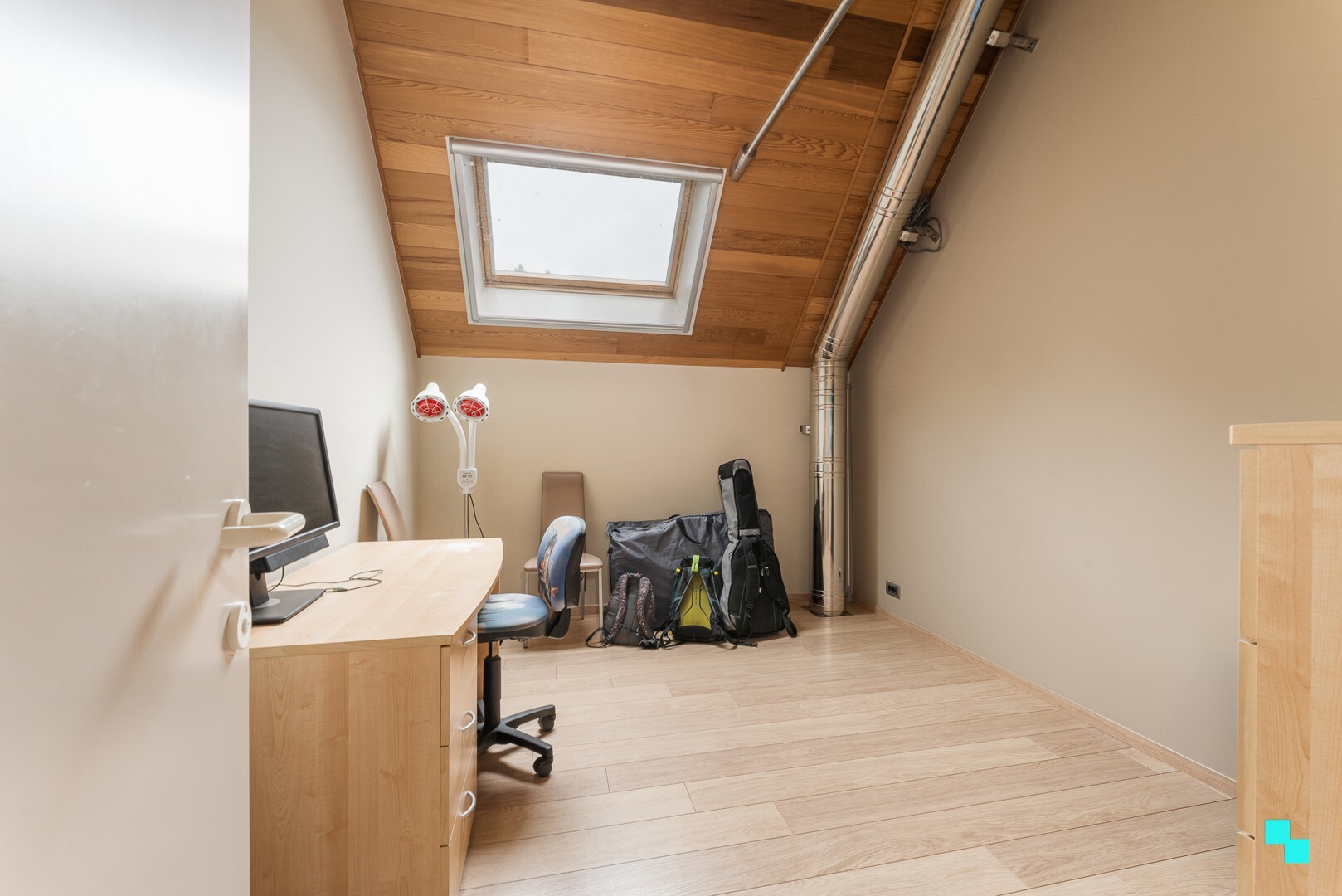 Open ruimte boven leefgedeelte dat werd ingericht tot bureau, aansluitend de master bedroom met naastliggende slaapkamer die kan omgevormd worden tot badkamer (afvoer en toevoer voorzien). In de andere vleugel van de woning bevinden zich de drie overige slaapkamers en de geïnstalleerde badkamer.Exterieur